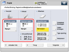 Als u voor het voorste dekblad, het achterste dekblad of de invoegbladen een ander papierformaat instelt, worden de papierformaten voor de andere functies automatisch gewijzigd in het nieuwe papierformaat. Het wijzigen van de papierbron voor een functie van een bron met hetzelfde formaat, zorgt er echter niet voor dat de instellingen voor de andere functies worden gewijzigd. Plaats papier in de Document Insertion Unit-N en geef het papierformaat op voordat u papier gaat invoeren vanuit de Document Insertion Unit-N. Om papier in te voeren vanuit de Document Insertion Unit-N, selecteert u [Invoeg- module 1] of [Invoeg- module 2]. Als voor de huidige opdracht papier wordt ingevoerd uit de Document Insertion Unit-N, drukt u op [Wijzig inv. 1 vel] of [Wijzig inv. 2 vel] om papier te selecteren voor de invoegbladen. |