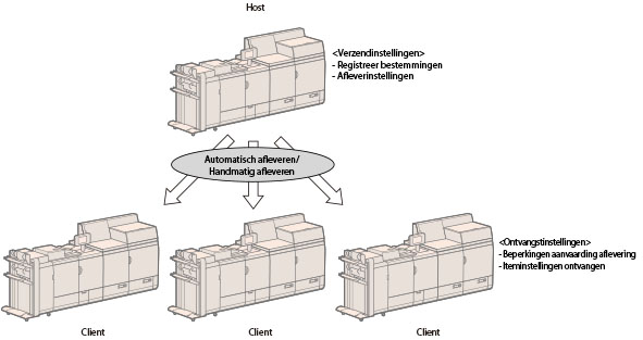 Het voorbereiden voor aflevering en bijwerken van de informatie nadat deze is ontvangen, kan enkele minuten duren. Zet de hoofdschakelaar pas uit nadat deze activiteiten zijn voltooid. Anders kan er een storing optreden. Apparaatinformatie kan worden gedeeld tussen machines van hetzelfde model. Sommige informatie kan wellicht niet juist worden afgeleverd. Dit is afhankelijk van de optionele apparatuur die op de machine is aangesloten. Als [Beperk ontvangst apparaatinformatie] voor <Ontvangstinstellingen> is uitgeschakeld, kan de machine apparaatgegevens geleverd door andere machinemodellen ontvangen. (Raadpleeg "Ontvangende machine instellen".) Sommige gegevens kunnen echter niet goed worden afgeleverd. Apparaatinformatie kan niet worden afgeleverd als de ID systeembeheerder en Systeem PIN die zijn opgeslagen in de cliënt machine afwijken van de ID systeembeheerder en Systeem PIN die zijn opgeslagen in de host machine. |