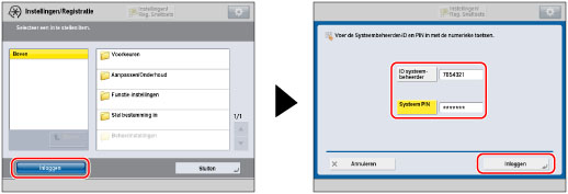 Zorg ervoor dat u systeembeheerder-PIN niet kunt vergeten. Als u de systeembeheerder-PIN bent vergeten, neem dan contact op met uw Canon-dealer. Als u afdelings-ID-beheer gebruikt, zijn de bewerkingen die algemene gebruikers op het scherm Instellingen/Registratie kunnen uitvoeren, beperkt. Om alle items op het scherm Instellingen/Registratie te kunnen gebruiken, voert u het ID van de systeembeheerder en de pincode van het systeem in om u aan te melden als beheerder. Voor informatie over de items onder Instellingen/Registratie die beschikbaar zijn met beheerdersbevoegdheden, raadpleegt u "Tabel met beschikbare beheerdersinstellingen (aanraakscherm)" en "Tabel met beschikbare beheerdersinstellingen (externe UI)". |