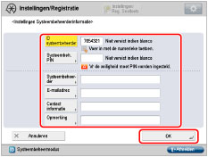 [Contact informatie]: | Druk op [Contact informatie] → voer de contactgegevens voor de systeembeheerder in → druk op [OK]. |