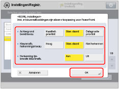 [Standaard]: | De gegevensgrootte en beeldkwaliteit van achtergrond ligt tussen die van [Datagrootte prioriteit] en [Kwaliteit- prioriteit] in. |