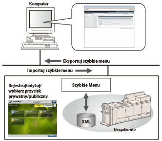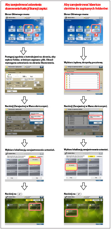 Szybkie menu jest funkcją która zwiększa efektywność działań wykonywanych za pomocą funkcji tego urządzenia. Istnieje możliwość tworzenia i rejestrowania często używanych ustawień funkcji takich jak Kopiowanie, Skanowanie i wysyłanie oraz Skanowanie i zapisywanie pod jednym przyciskiem.