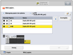 Jeżeli w trakcie drukowania pojawi się komunikat podpowiadający o konieczności załadowania papieru, wtedy pozostałe strony zostaną automatycznie wydrukowane po włożeniu właściwego papieru. W przypadku wybrania innego źródła papieru, pozostałe strony zostaną wydrukowane po wciśnięciu klawisza [OK]. |