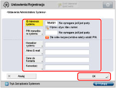 [ID Administr. systemu]: | Naciśnij na [ID Administr. systemu] → wprowadź znaki numeryczne (do siedmiu cyfr) za pomocą - (klawisze numeryczne). Chcąc zarządzać pracą urządzenia trzeba wprowadzić NI Administratora Systemu. |