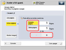 Carregue em [Primeira página] e [Última página] → especifique a primeira e última páginas que pretende apagar utilizando [-] ou [+].