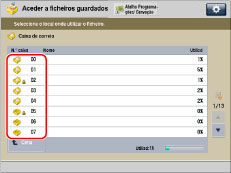 Os ficheiros selecionados são numerados pela ordem especificada e impressos pela mesma ordem. Pode cancelar uma seleção se voltar a especificar o ficheiro. Para cancelar todas as seleções de ficheiros, carregue em [Apagar seleção]. ([Apagar seleção] muda para [Selecionar tudo (máx. 100 fich.)].) Se existirem dois ou mais ficheiros guardados na caixa de correio, pode carregar em [Nome] ou [Data/Hora] para ordenar a lista de ficheiros. Se fechar a caixa de correio depois de ordenar os ficheiros, estes voltam a ficar desordenados da próxima vez que abrir a caixa de correio. Se guardar um ficheiro na caixa de correio a partir de um computador ou se, depois de ordenar os ficheiros, apagar um deles da caixa de correio, a lista atualizada permanece ordenada. Se carregar em [Nome] ou [Data/Hora] com um ficheiro selecionado, anula a seleção desse ficheiro e aparece o topo da lista de ficheiros. |