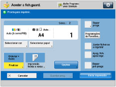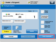 Para cancelar a impressão, carregue em [Cancelar]. Não pode cancelar a impressão carregando em .Para reservar o próximo trabalho de impressão, carregue em [Fechar] → execute o procedimento para reservar um trabalho de impressão.(Consulte " Reservar trabalhos".) |