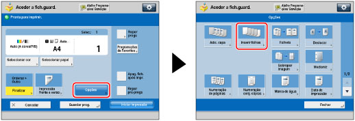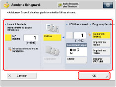 Pode inserir um total de 100 folhas ou páginas de capítulo. Se utilizar papel já impresso (por exemplo, com o logótipo da empresa) como folha a inserir, tem de selecionar [Deixar em branco]. Caso contrário, a máquina imprime no papel pré-impresso. O deck para papel já especificado como origem do papel não pode ser selecionado no modo de Seleção automática do papel. |