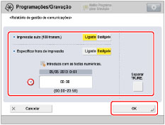 Carregue em [Ligado] para imprimir o relatório de gestão de comunicações automaticamente quando atingir as 100 transmissões de envio e receção.