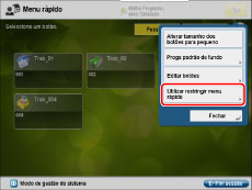 Só o administrador do sistema pode configurar as programações de restrição de acesso ao Menu rápido. Para obter informações sobre o administrador, consulte "Programações de administrador". Se a gestão da ID de departamento não estiver programada, os botões pessoais não aparecem. |