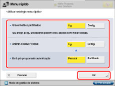 <Gravar botões partilhados>: | Se programar <Gravar botões partilhados> para [Ligado], os utilizadores em geral e os utilizadores não autorizados podem gravar, editar ou apagar o botão Partilhado ou então alterar o tamanho dos botões e da imagem de padrão de fundo. |