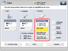 Especificar por formato finaliz. | Corte de 3 vias | Largura do formato de finalização + 6,5 mm a 49,5 mm (182,0 mm a 228,6 mm) | Largura do formato de finalização + 13,0 mm a 79,0 mm (257,0 mm a 320,0 mm) |