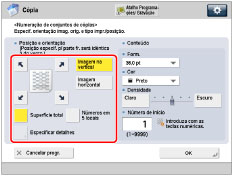 O desempenho de impressão pode não ser o ideal, dependendo do conteúdo do original e da combinação de programações. Se utilizar [Numeração conj. cópias] com [Adicionar capa] ou [Inserir folhas], a máquina não imprime números nas páginas inseridas. |