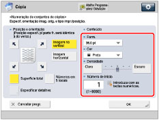 Se programar [Opção número] para "Ligado", pode programar o tamanho dos números de conjuntos de cópias para [10,5 pt], [12,0 pt] ou [14,0 pt].(Consulte "Opções do modo Numeração de conjuntos de cópias".) |