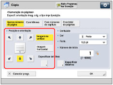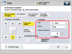 Se programar qualquer grupo de dois entre [Numeração conj. cópias], [Marca de água], ou [Data de impressão] para imprimir na mesma posição, aparece uma mensagem de confirmação quando carregar em  . |