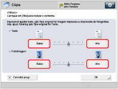 Para copiar texto ou linhas com nitidez, a programação deve estar mais próxima de [Alto] para a área de texto. Para copiar originais com fotografias impressas ou outros meios tons, a programação deve estar mais próxima de [Baixo] para a área de fotografia/imagem.
