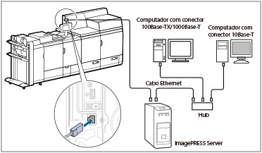 Esta secção descreve a ligação à rede com um cabo LAN e as definições de rede no painel de controlo. Para obter mais informações sobre as definições de rede, consulte o manual do imagePRESS Server. Este pacote não inclui um cabo de rede. Deve adquirir um cabo adequado ao seu computador ou rede. Para mais informações sobre a ligação, contacte o revendedor local autorizado da Canon. |