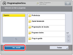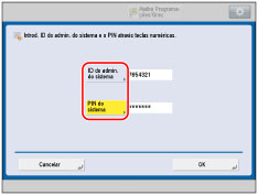 As operações disponíveis no ecrã Programações/Gravação variam entre os administradores e os utilizadores em geral. Para os administradores: O administrador do sistema pode especificar todas as programações de sistema da máquina. As programações do administrador do sistema (ID do administrador do sistema/PIN do sistema) estão pré-programadas na máquina. Deste modo, o administrador tem de iniciar sessão introduzindo a ID do administrador do sistema e o PIN do sistema. A pré-programação, tanto para a ID do administrador do sistema como para o PIN do sistema, é "7654321". Recomenda-se que altere a ID do administrador do sistema e o PIN do sistema. Para obter mais informações sobre como programar a ID do administrador do sistema e o PIN do sistema, consulte "Especificar as programações do administrador do sistema". Para obter mais informações sobre as opções Programações/Gravação disponíveis com privilégios de administrador, consulte "Tabela de programações de administrador disponíveis (visor do painel digital)" e "Quadro de programações de administrador disponíveis (UI remota)". Para os utilizadores em geral: Algumas opções no ecrã Programações/Gravação podem ter restrições para os utilizadores em geral. As opções para as quais um utilizador não tem privilégios de utilização estão esbatidas e não podem ser selecionadas no visor do painel digital. As opções para as quais um utilizador não tem privilégios de utilização não aparecem na UI remota. |