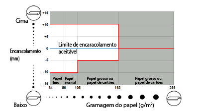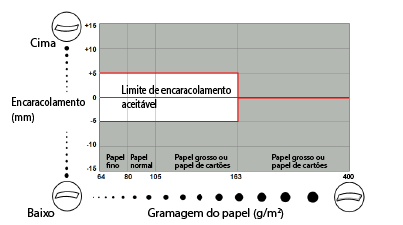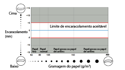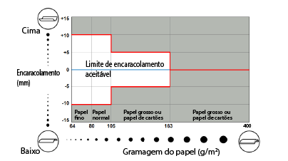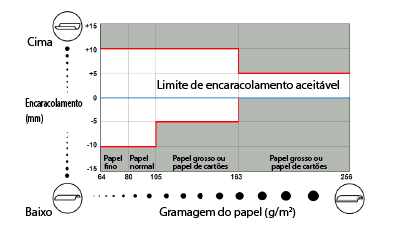 Se for colocado papel com gramagem entre 106 e 163 g/m2, recomendamos a utilização de papel que encaracole 10 mm ou menos para cima, ou papel que encaracole 5 mm ou menos para baixo.