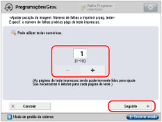 Quanto maior for o número de páginas de teste impressas, mais preciso é o ajuste. Se especificar a impressão de várias páginas de teste, certifique-se de que todas as páginas de teste são lidas pela ordem pela qual são impressas. Se a ordem for alterada ou se o processo de leitura não for realizado de forma sucessiva, o ajuste pode não ser feito corretamente. |