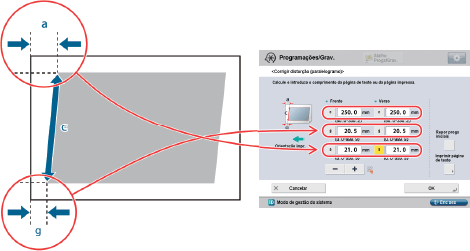 Utilizando os dois valores numéricos indicados a seguir e "c = 250,0", um dispositivo ajusta o comprimento para corrigir a distorção na área de impressão.