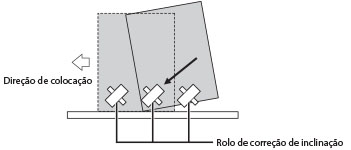 O rolo de correção de distorção está localizado na unidade de alimentação da unidade de impressão. Ajusta a posição gravada do papel alimentado empurrando o papel na diagonal contra a parede no interior da unidade de alimentação. Se a programação do nível de correção de distorção estiver incorreta, a imagem é impressa inclinada.