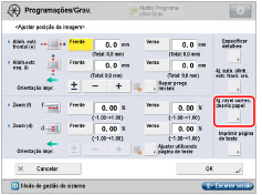 Se o alinhamento da imagem apresentar uma variação significativa em folhas grossas, carregue em [+]. Se ocorrer um encravamento de papel em folhas finas, carregue em [-]. Se a situação não melhorar, ajuste o valor da programação em [Conveyance Speed: Rear] abaixo.