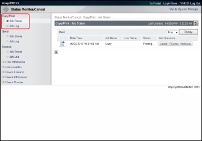 Clique em [Job Log] → selecione o trabalho cujo estado pretende visualizar a partir da lista pendente → clique em [Display].