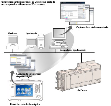 A UI remota (interface de utilizador) é o software pré-instalado na máquina que permite aceder às funções da máquina utilizando um Web browser. Por exemplo, a UI remota permite aceder à máquina para verificar o estado dos trabalhos, executar trabalhos e especificar várias programações. Para poder utilizar a UI remota, basta um Web browser e uma ligação de rede entre o computador e a máquina.