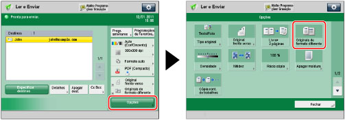 Se programar Formato de leitura para todas as opções menos para [Auto], todos os originais são lidos no formato especificado. Se quiser fazer a leitura de cada original no seu formato de origem, programe Formato de leitura para [Auto]. Se colocar originais de formato diferente no alimentador, certifique-se de que têm a mesma gramagem (tipo de papel). Se programar o modo Originais de formato diferente, a velocidade de leitura pode ficar mais lenta do que o normal. |