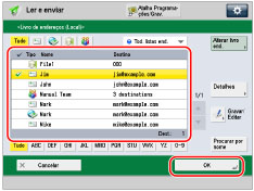 Os dados do livro de endereços local podem ser gravados e importados através da UI remota.(Consulte "Carregar informações de programações (importar individualmente)".) Se selecionar apenas um destino, carregue em para enviar a partir do ecrã Livro de endereços. |