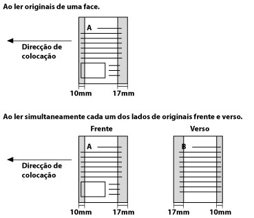 Se a opção [Auto (Cor/Cinz.)] ou [Auto (Cor/P/B)] estiver programada e os originais tiverem secções com cores, a máquina lê-os no modo Todas as cores. No entanto, a máquina pode ler os originais a cores no modo Preto nas seguintes condições. Para evitar que isto aconteça, programe o modo de cor para [Todas as cores]. Se os originais contiverem muito poucas secções a cores Se as secções a cores dos originais forem quase pretas Se os originais contiverem densidades de cores claras Se as secções a cores estiverem localizadas apenas no intervalo indicado pelo diagrama abaixo, quando colocar os originais no alimentador ![]() |