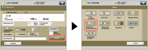 Se programar Formato de leitura para todas as opções menos para [Auto], todos os originais são lidos no formato especificado. Se quiser fazer a leitura de cada original no seu formato de origem, programe Formato de leitura para [Auto]. Se colocar os originais no alimentador, certifique-se de que os originais de formato diferente têm a mesma gramagem (tipo de papel). Se programar o modo Originais de formato diferente, a velocidade de leitura pode ficar mais lenta do que o normal. |