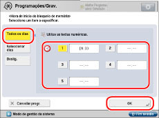 Se selecionar [Todos os dias], escolha um número ([1] a [5]) → introduza a hora de início utilizando