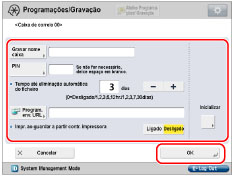 Se programar a máquina para enviar uma hiperligação por correio eletrónico para a caixa de correio onde está guardado o ficheiro, pode verificar ou efetuar operações no ficheiro guardado na caixa de correio, utilizando a UI remota (interface de utilizador) da máquina. Se quiser enviar uma hiperligação por correio eletrónico para uma caixa de correio, carregue em [Program. env. URL] → especifique o destino → carregue em [OK].