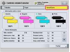 Verifique a quantidade restante de toner e agrafos, a percentagem de utilização da memória e a quantidade de desperdícios de toner.
