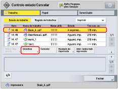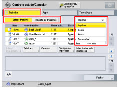 Carregue em [Trabalho] → [Estado trabalho] ou [Registo de trabalhos] → selecione o tipo de trabalho na lista pendente.