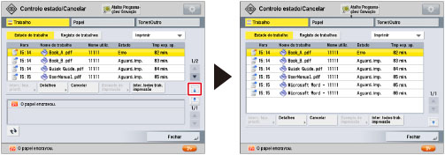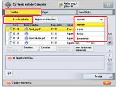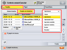 Os ícones do lado esquerdo do ecrã indicam o estado do trabalho. Para obter informações sobre os tipos e os detalhes dos ícones, consulte "Ícones do ecrã Trabalho". Se selecionar [Imprimir] em tipos de trabalhos, aparece o tempo de espera aproximado de cada trabalho a ser processado. |