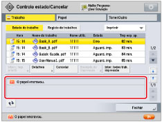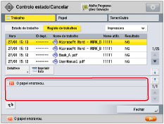 O trabalho cancelado aparece como <NG> (No Good - Não OK) no ecrã Registo. Se o papel especificado na altura em que o trabalho foi emitido não estiver disponível, aparece uma mensagem a pedir para colocar o papel adequado. Coloque o papel e retome o trabalho. Se a opção [Tempo de inatividade do trabalho suspenso] em [Programações de funções] (Programações/Gravação) estiver programada para "Ligado", o trabalho suspenso devido à falta de papel para impressão aparece como trabalho suspenso decorrido um determinado tempo. Para retomar a impressão do trabalho suspenso, coloque o papel → selecione o trabalho → carregue em [Detalhes] → [Retomar]. |