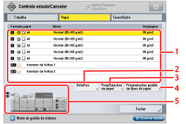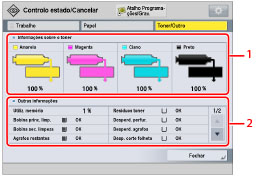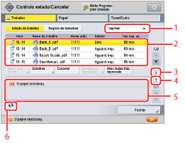 , aparece o ecrã Controlo de estado/Cancelar. Neste ecrã pode alterar a ordem dos trabalhos, cancelar trabalhos e confirmar informações detalhadas sobre o estado do trabalho e o registo de trabalhos. Também pode obter informações detalhadas sobre consumíveis.