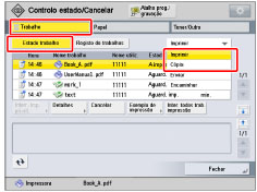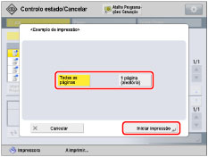 Não pode selecionar [Exemplo de impressão] para os seguintes trabalhos. Um trabalho para o qual está programado o modo Agrupar ou Offset Agrupar Um trabalho que está em pausa ou à espera de ser copiado/impresso Um trabalho cuja impressão está atualmente interrompida Um trabalho que está atualmente a ser copiado/impresso como exemplo Um trabalho que está atualmente a ser impresso como exemplo Se a cópia restante for a última ou quase a última, não pode fazer um exemplo de impressão de toda a cópia selecionando [Todas as páginas]. Se as páginas de um trabalho cópia forem poucas, pode não conseguir fazer um exemplo de impressão selecionando [1 página (aleatória)]. A impressão pode demorar algum tempo, mesmo que selecione [Exemplo de impressão]. |