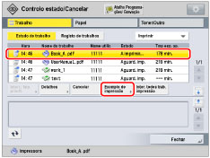 Depois de concluído o exemplo de impressão, a máquina retoma automaticamente o trabalho de impressão. Se for necessário ajustar as programações, carregue em [Cancelar] ou Inter. todos trab. impressão e depois faça o ajuste necessário. |
