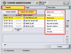 Pode imprimir listas de estado de trabalhos para trabalhos de envio, além de listas de registos de trabalhos. Para imprimir listas de estado de trabalhos, selecione [Enviar] a partir da lista pendente → carregue em [Imprimir lista]. |