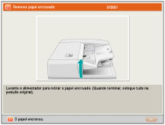 Se o papel encravar no alimentador, não pode continuar a utilizar a máquina. Siga as instruções do visor do painel digital para retirar o papel encravado. (Consulte "Duplex Color Image Reader Unit-M (opcional)".) Algumas áreas indicadas como tendo papel encravado podem, na realidade, não o ter. No entanto, inspecione sempre todas as zonas indicadas no visor do painel digital pela ordem apresentada. Se ocorrer um encravamento de papel e a impressão for interrompida quando estiver a imprimir no modo Agrafar, retire o papel apenas das áreas indicadas no visor do painel digital como tendo papel encravado. Por exemplo, se o papel estiver encravado na unidade principal, não retire as folhas impressas do finalizador, o qual não tem papel encravado (a máquina retoma a impressão e o agrafamento depois de retirar o papel encravado na unidade principal). Não remova qualquer unidade antes de retirar o papel encravado, a menos que tal seja explicitamente especificado nas instruções. Se o fizer, poderá rasgar o papel e deixar pedaços de papel no interior da máquina. |