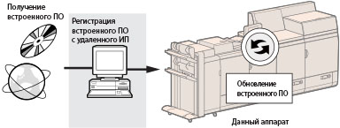 Обновить встроенное программное обеспечение аппарата до новейшей версии можно с помощью функции "Регистрация/Обновление ПО", используя удаленный ИП.