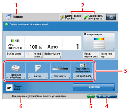 6. | Здесь отображаются процесс выполнения заданий и операций копирования, а также состояние устройств и расходных материалов. Если задан режим Управление ИД отдела, отображается ИД отдела, используемый для входа в систему аппарата. |