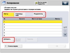Параметры отображаются по порядку вставки. Параметры вставки вставных листов, титульных страниц глав или листов разделителей можно проверить/изменить, нажав клавишу [Детали/ Правка] после выбора параметров. Чтобы удалить вставку листов, выберите параметр для удаления → нажмите клавишу [Удалить]. Убедитесь, что количество разделителей, показанных на экране настройки ширины сдвига на разделителе, соответствует количеству разделителей, установленных в данном источнике бумаги. |