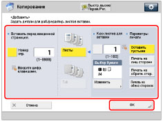 Можно вставлять всего до 100 листов вставки (или страниц глав) и листов разделителей. Если в качестве вставки используется бумага, на которой уже что-либо напечатано (например логотип компании), необходимо выбрать вариант [Оставить пустыми]. В противном случае копирование будет выполняться на бумаге, на которой уже была выполнена печать. Стойка для бумаги, которая уже указана в качестве источника бумаги, не может быть выбрана в режиме Автоматический выбор бумаги. |