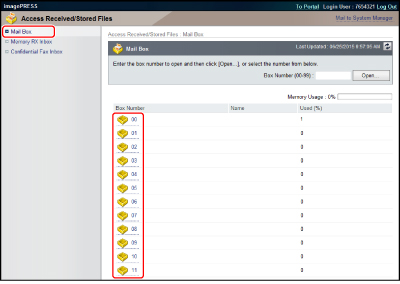 Нажмите кнопку [Access Received/Stored Files] → выберите [Mail Box] → щелкните номер требуемого почтового ящика.