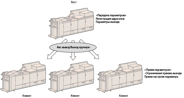 Значение, заданное в Параметры/Регистрация | Параметры, задаваемые на экране Дополнительные функции (исключая вышеприведенные параметры) | Некоторые параметры экрана Параметры/Регистрация не выводятся. Дополнительные сведения см. в разделе "Таблица Параметры/Регистрация". Сведения для почтовых ящиков, задаваемых с паролем, не выводятся. Сведения для почтовых ящиков, задаваемых с паролем в клиентском аппарате, не перезаписываются. Если не производится одновременный вывод параметров [Знач., заданное в Пар./Рег.] и [Адресная книга], параметры в пункте [Пар. пер. с URL] разделов [Задать яч. факса/И-факса] и [Параметры почт. ящика] могут быть стерты. |